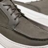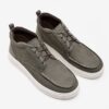 Confeccionado em couro na cor cinza, possui o fechamento em cadarço de amarrar, bico arredondado e possui uma costura na parte superior do cabedal.