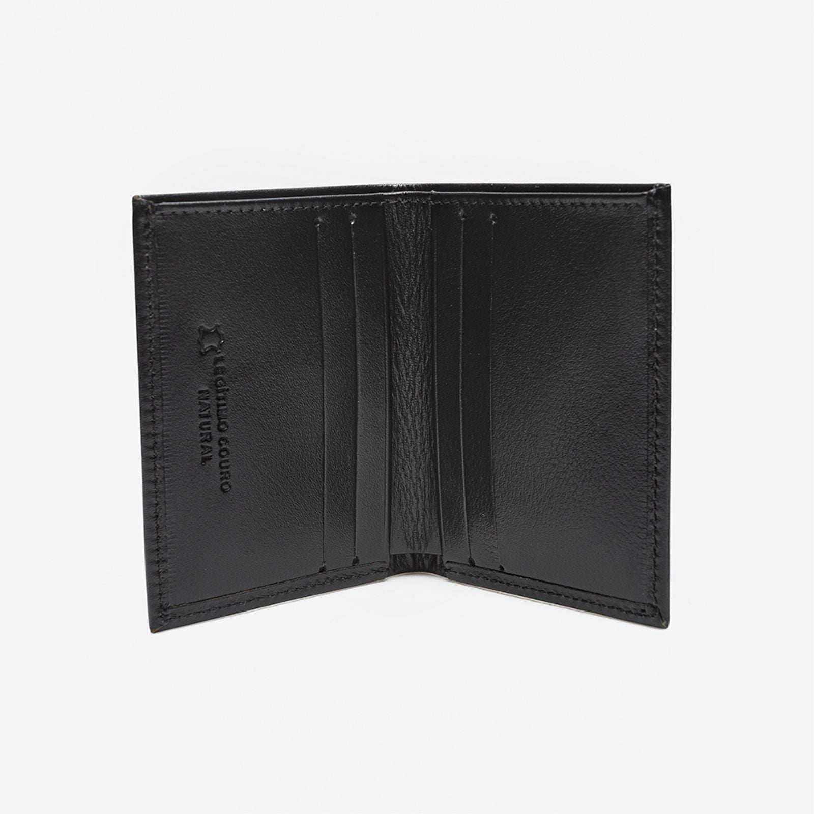Parte interna com 6 divisórias para cartões, e 1 abertura total para documentos e cédulas.