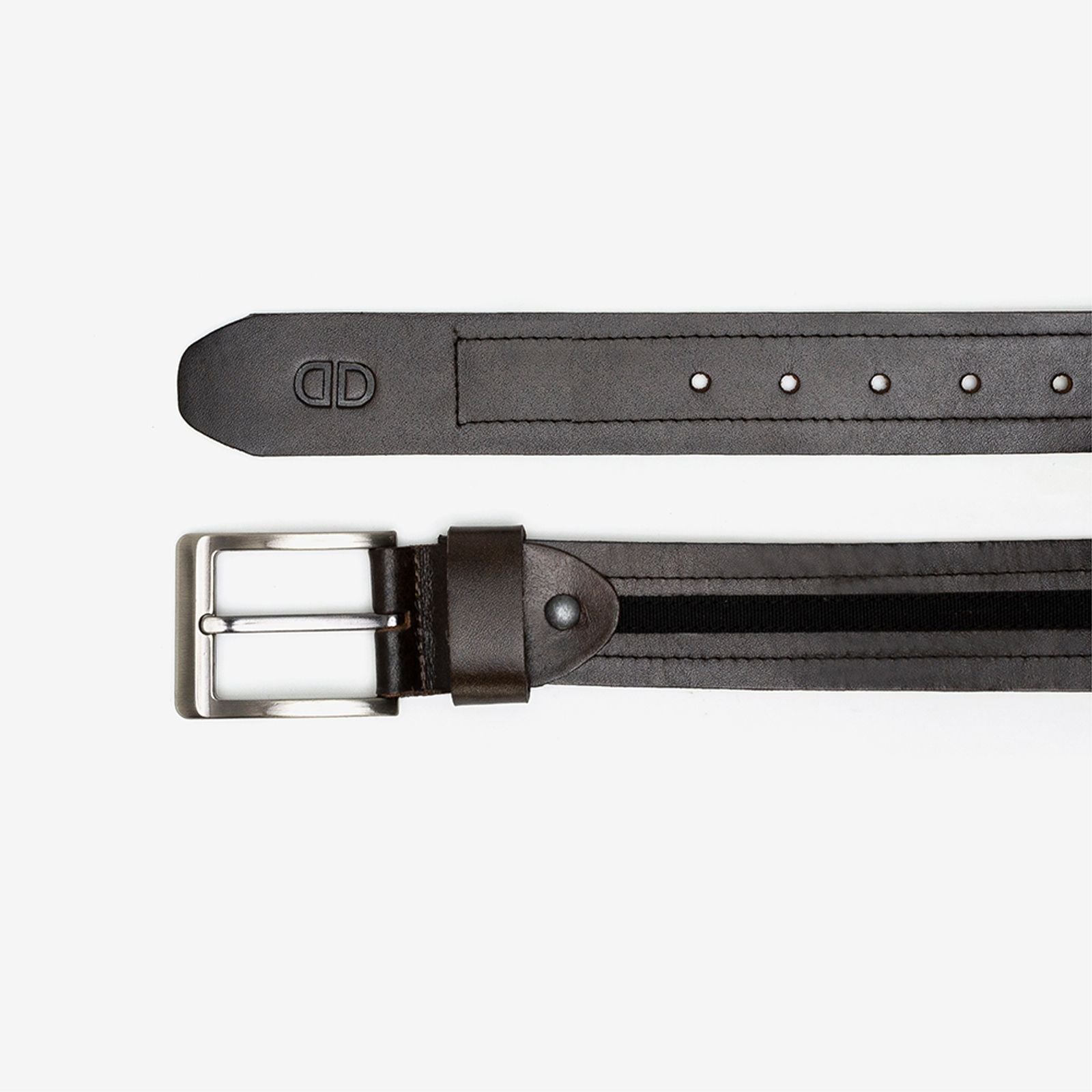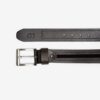 Cinto confeccionado em couro na cor carvão, com uma tira de tecido no meio na cor preta e costura decorativa nas laterais. Fivela de metal, logo da marca na ponta e cinco furos para melhor ajuste.