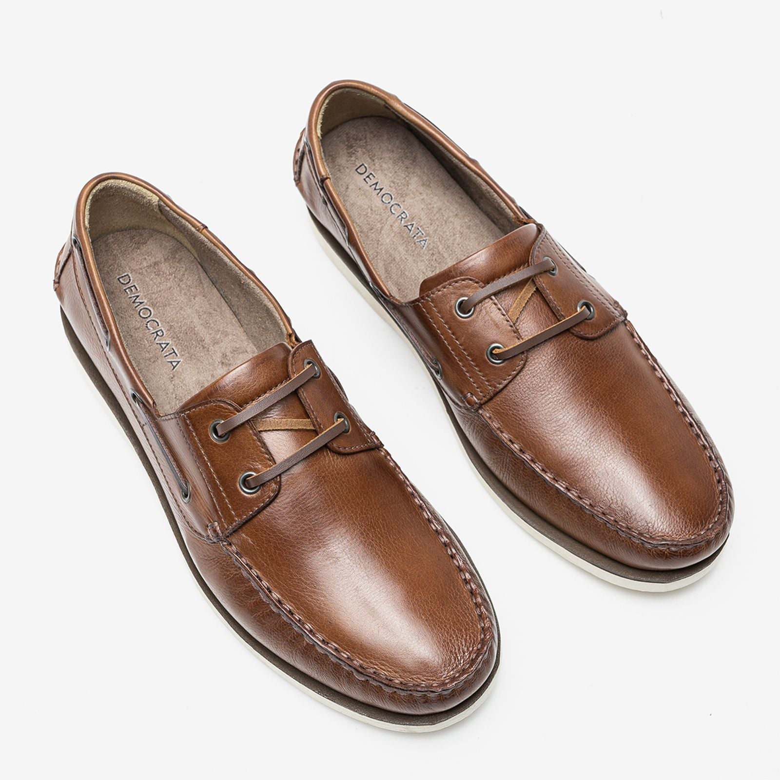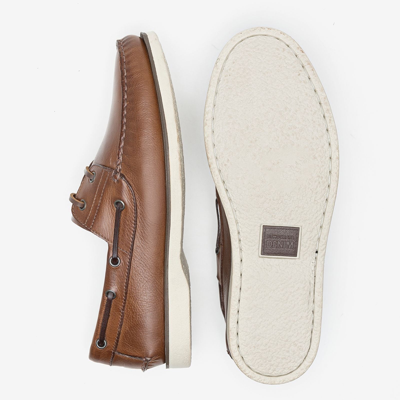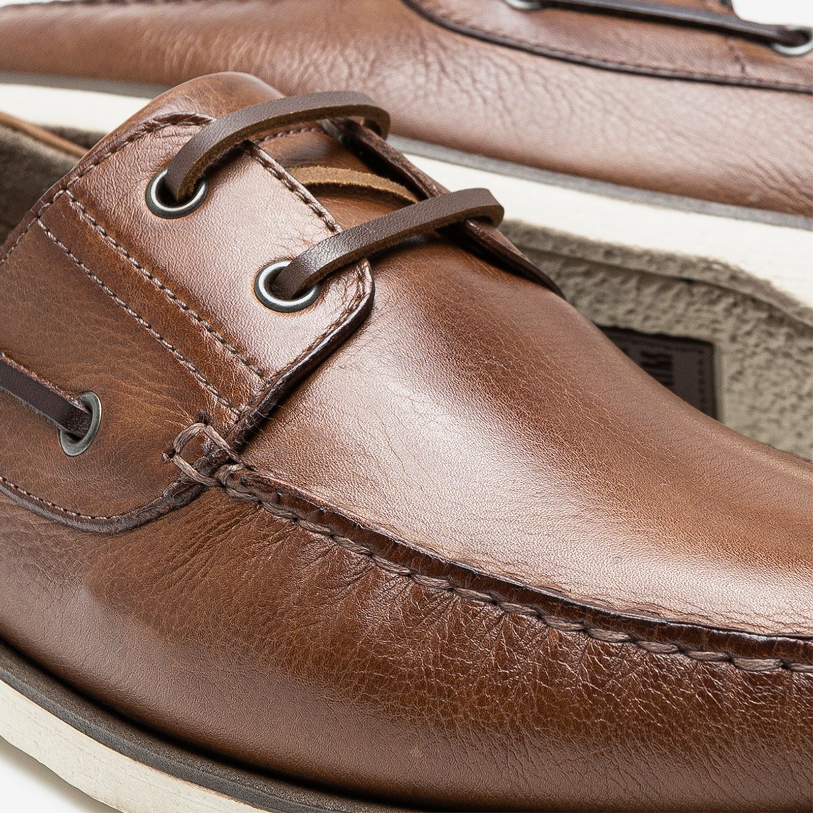 Sider produzido em couro, na cor tan/carvalho. Fechamento em tira de couro com ilhós nos passantes, forro em tecido, tira de couro marrom decorativa em volta do colarinho na parte externa, frente do cabedal costurada a mão. Sola de micro expandido blaqueada com uma pequena faixa de cor café em volta, palmilha macia e bico arredondado.